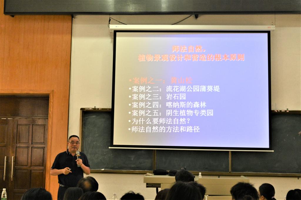 名誉院长、浙江省风景园林学科带头人包志毅教授,在兴农楼109室为师生作《师法自然———设计和营造植物景观》的专题讲座。讲座由吴刘萍教授主持,园林系部分教师、研究生、本科生近150余人参加报告会。
