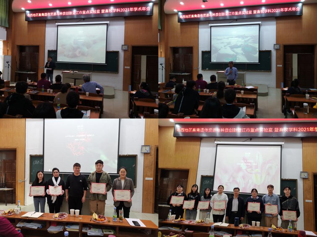 会议主题为“新种质、新方法、新技术、新模式”,20位硕士研究生分别围绕畜禽分子遗传与动物育种、高效繁殖技术、动物营养调控研究与新饲料资源开发、畜禽健康养殖与疾病防控等领域的研究进展进行了学术报告。经过评委现场打分,最终评选出一等奖2名,二等奖4名,优秀奖14名。学术报告会后,马驿副院长指出,畜牧学科在2021年取得的成绩离不开每位导师和研究生的辛苦付出,对获奖同学表示祝贺,希望畜牧学科在新的一年取得更大的成绩。同时,学术年会期间,畜牧学科带头人赵志辉教授还就师资队伍建设、博士点申报、青年教师成长等问题与学科教师进行了深入交流和充分研讨。此次学术年会的成功举办,对促进畜牧学科师生学术交流,活跃学术氛围,提升学科和湛江市重点实验室建设水平等具有积极作用。