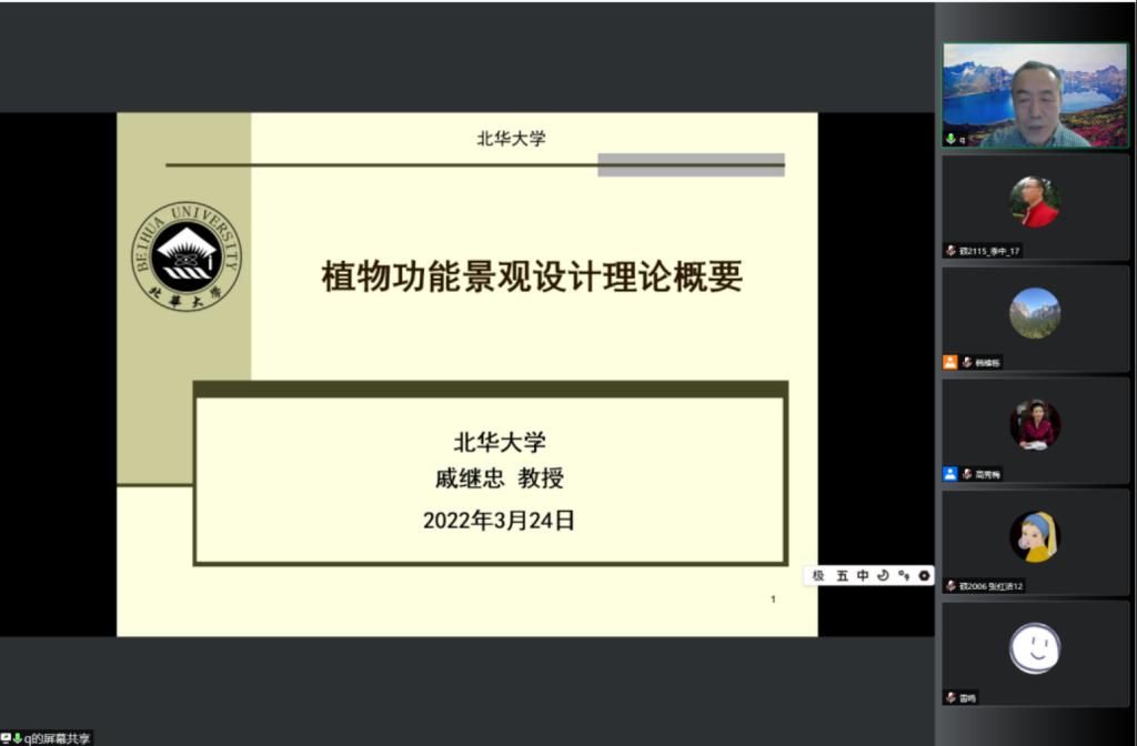 在线举行风景园林学科学术报告会——植物功能景观设计理论概要。高秀梅副校长出席并发表贺词。报告会由东北林业大学博士研究生导师、原北华大学副校长、吉林省特色高水平学科——风景园林学科首任学科带头人戚继忠教授主讲。风景园林专业老师、研究生、本科生共150多人参加了会议。报告会由风景园林学科带头人韩维栋教授主持。