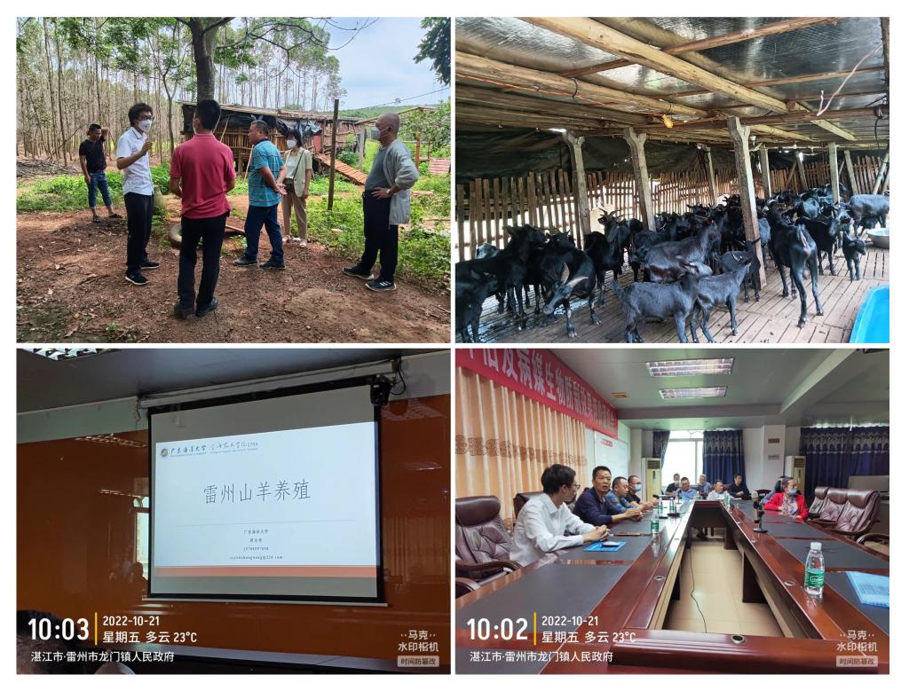 动物科学系教师、湛江市驻镇帮镇扶村农村科技特派员周光现博士及其团队成员多次赴雷州龙门镇服务乡村振兴工作。主要围绕雷州山羊养殖繁育技术及其养殖推广相关工作开展。2022年6月到龙门镇雷州山羊养殖户中交流雷州山羊养殖经验,指导山羊舍修建工作。7月带领工作队队长等人去状元黑山羊养殖场、雷州山羊保种场等养殖基地参观学习,了解雷州山羊养殖情况。8月去陕北地区考查农村养羊模式和规模化现代化养羊基地等,为龙门镇山羊养殖业取经。10月再次到龙门镇开展雷州山羊羊舍设计、雷州山羊养殖技术培训等工作,同时向工作队、村委书记和农户等人汇报陕北家庭致富山羊养殖模式。会议就龙门镇撂荒地、林地开发利用做出了初步规划,采用种养结合模式提高土地使用价值。雷州山羊为雷州半岛特色山羊品种,耐湿热、食谱广;龙门镇大部分地区是玄武岩台地,属红黏土地带,坡地多、坑田少,适宜于山羊养殖。本土雷州山羊肉质鲜美、膻味小,深受广大消费者喜爱,其活羊价格平均高达40元/斤,具有良好的经济价值。龙门镇当地雷州山羊养殖农户较少,但具有20余年雷州山羊养殖历史的成功典范,故此雷州山羊养殖可以在龙门镇推广。