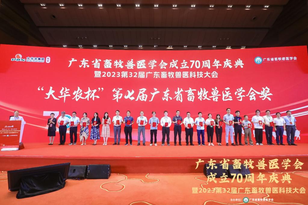 上海兽医研究所童光志研究员等畜牧兽医行业知名专家受邀作学术报告。我校尹福泉教授受邀在动物营养与饲料科技论坛作了题为“海洋活性多糖的营养生理功能及调控机制”的学术报告;郭富城博士受邀在水禽产业高质量发展论坛作了“跨种感染人的H5Nx禽流感病毒的适应性进化研究”的学术报告;刘文超副教授指导的研究生王垚垚在研究生论坛作了题为“基于Ⅱ相解毒酶途径及肠-肝轴研究纳米硒-浒苔多糖对AFB1诱导肉鸡肝脏损伤的保护作用”的学术报告。三个报告介绍了我校畜牧学科(畜牧和兽医领域)的部分研究成果,得到与会专家的广泛认可。为奖励对全省畜牧兽医行业做出巨大贡献的杰出人才,本次会议还举行了学会成立70周年和“大华农杯”颁奖仪式。经过专家评审,我校畜牧学科带头人赵志辉教授荣获“大华农杯”第七届广东省畜牧兽医学会“杰出科技工作者”称号,动物医学系主任巨向红教授荣获广东省畜牧兽医学会成立70周年“青年科技奖”。