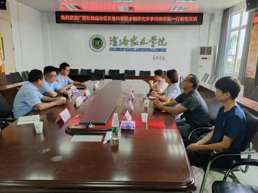 的学科配置、科研情况。李丹婷简要地介绍了广西水稻所的基本概况、科研团队以及国家普通野生稻种质资源保护圃的情况,并提出希望能与我校在水稻研究上互通有无、共谋发展,特别是在海水稻种质资源创新研究方面深入合作。郑殿峰表示非常赞同李所长的提议,也希望我们能在科研人员交流学习、种质资源共享、项目联合申报、科研联合攻关等方面加强合作。