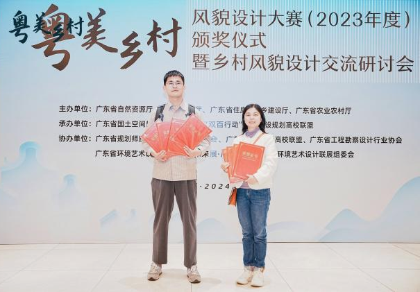 2024年3月22日,我校教师代表黄艳娜和梁子鑫老师参加“粤美乡村”风貌设计大赛(2023年度)颁奖仪式暨乡村风貌设计交流研讨会。本次会议由广东省自然资源厅、广东省教育厅、广东省住房和城乡建设厅、广东省农业农村厅主办,广东省国土空间规划协会、广东省“双百行动乡村建设规划高校联盟”承办。