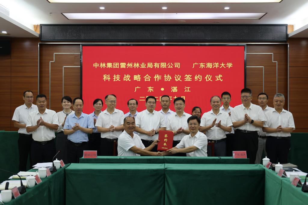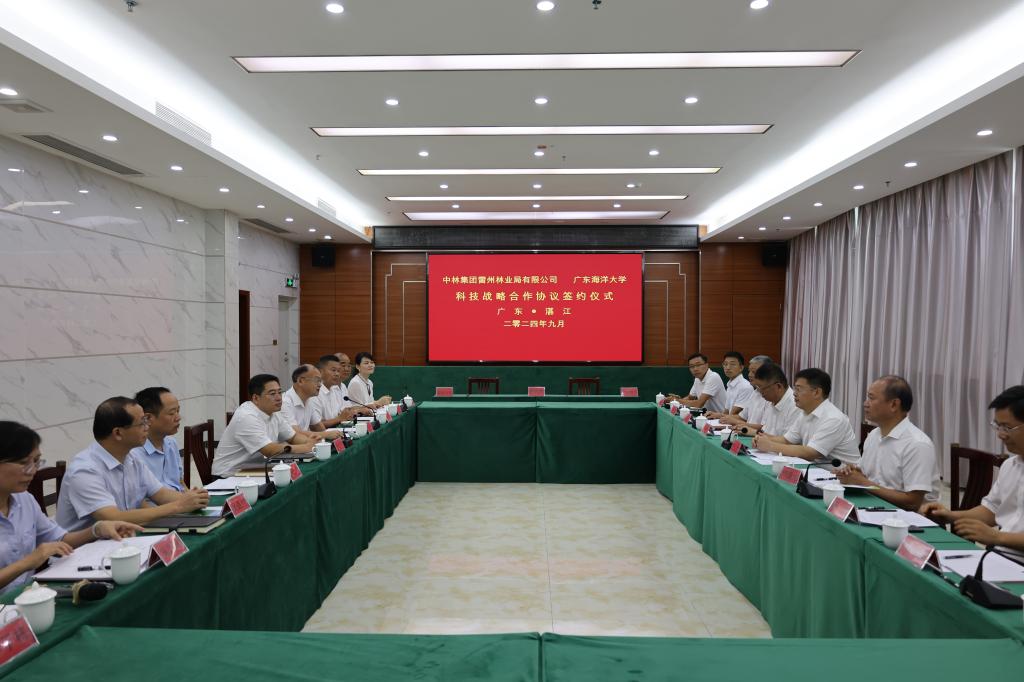 座谈会上,张立丰代表雷林公司对我校领导一行表示热烈欢迎,并介绍了中林集团及雷林公司的企业概况。邓逢光介绍了广东海洋大学近年来的发展建设情况。马驿和陈文平分别代表双方签署了《广东海洋大学与中林集团雷州林业局有限公司科技战略合作协议》。随后,双方围绕党建共建、人才培养、科研攻关、平台建设、社会服务进行了深入交流。
