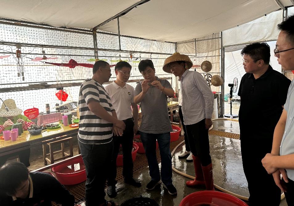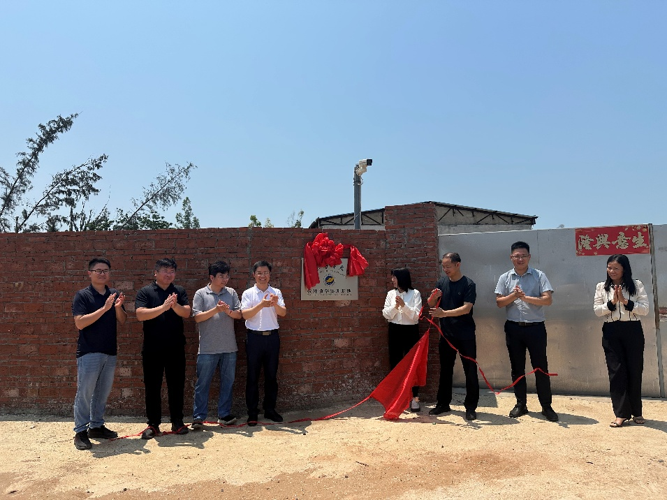会后,在西连镇镇长陈杭、镇党委副书记劳良强以及驻镇帮镇扶村工作队队长肖永的陪同下,科技特派员团队一行深入珍珠养殖产业以及东风螺生态养殖示范基地实地调研。在珍珠贝插核作业区,水产养殖专家王庆恒教授手持样本贝为养殖户现场演示“插核”手术操作规范,从贝体切口定位到术后消毒养护,逐一讲解。随后,在东风螺养殖池畔,马驿院长与陈杭镇长共同为广东海洋大学校外教学实训基地揭牌,该基地将承担养殖技术示范、人才实训等核心功能。