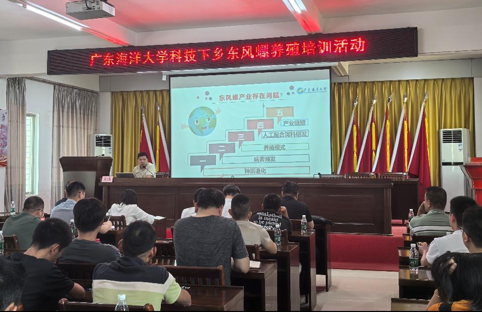 聚焦养殖技术需求,集结我校水产养殖领域专家,联合西连镇政府举办东风螺养殖专题培训会,养殖户代表、农技人员及政府相关部门负责人等30余人参会。会上,我校水产养殖专家吕文刚对东风螺养殖中的疫病防控、水质调控等关键技术及重点环节进行了详细讲解,并结合典型病害进行实景剖析,有效提升养殖户病害预警与防控能力。特派员团队现场向参训养殖户发放消毒剂、多维电解质等渔用物资大礼包。