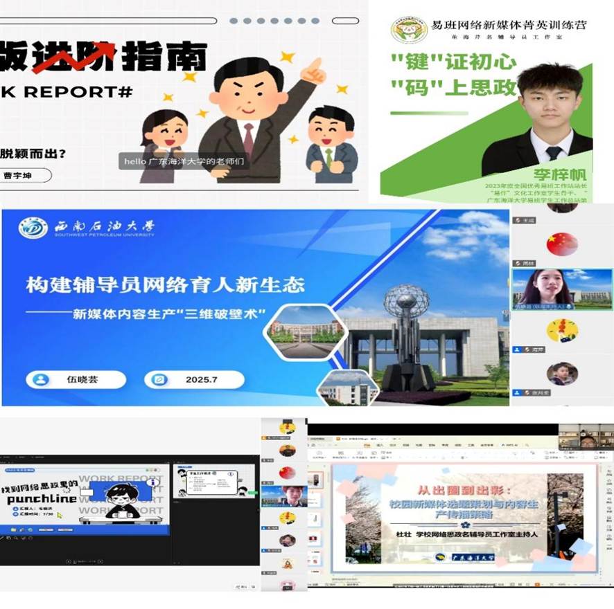 为深入贯彻落实习近平总书记关于宣传思想工作的重要指示精神,提升师生新媒体运营与内容创作能力,董海芹名辅导员工作室于暑期联合广东海洋大学杜壮名辅导员工作室、西南石油大学“E路同行”辅导员工作室、西南石油大学“成长部落”网络教育名师工作室共同举办易班网络新媒体菁英训练营。训练营创新采用“线上+线下”融合教学模式,累计参与人数突破500人次。